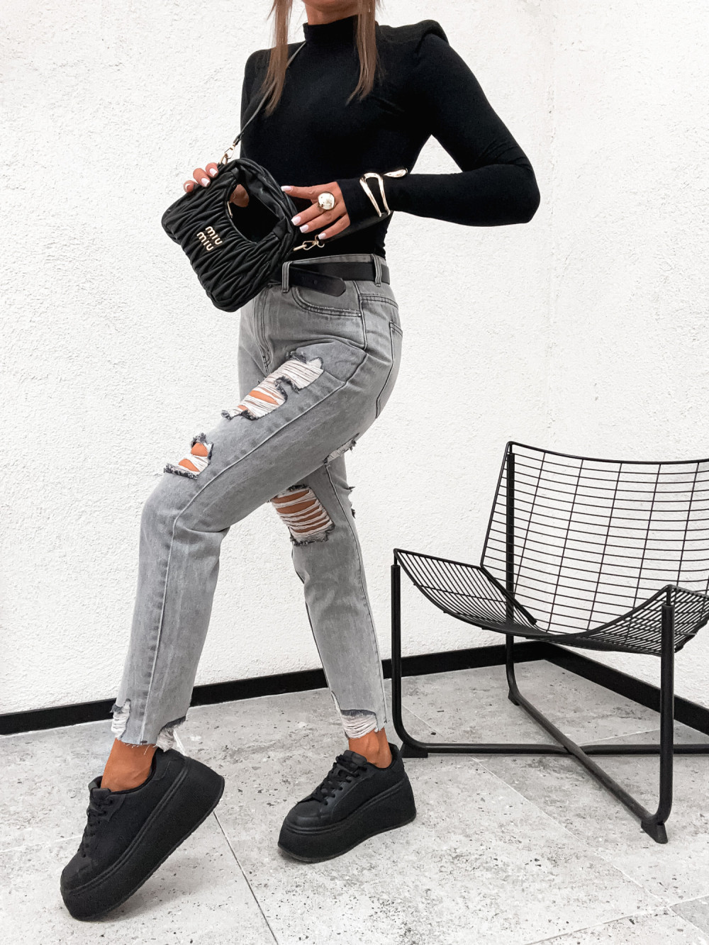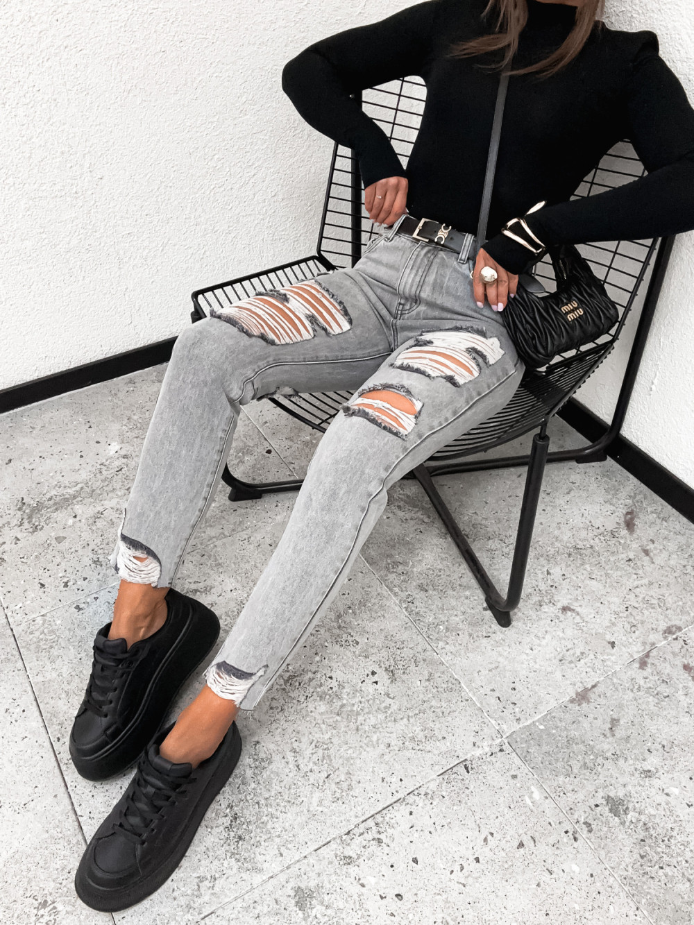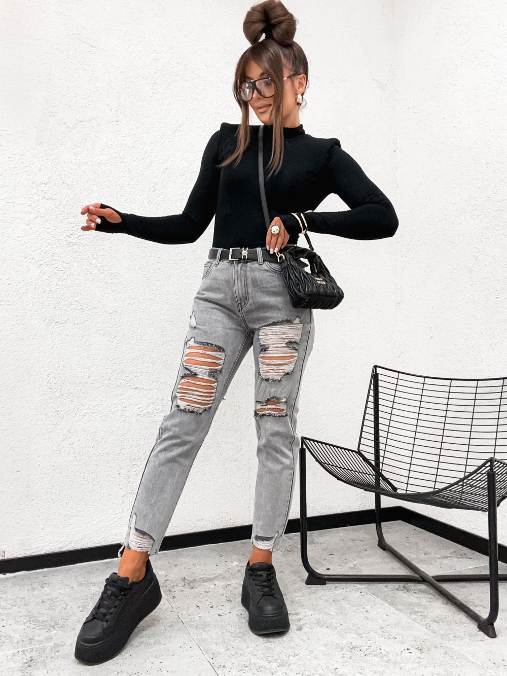 Stylowe spodnie z denimu w kolorze szarym to ponadczasowy element damskiej garderoby. Modny fason z przetarciami na nogawkach doskonale pasuje do codziennych swobodnych stylizacji z T-shirtem, bluzą lub swetrem. Spodnie z denimu to ponadczasowy element damskiej garderoby, który możesz wykorzystać nie tylko w tym sezonie.