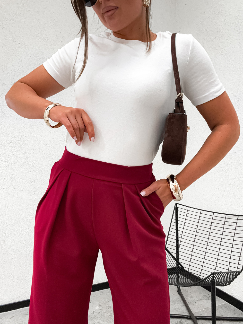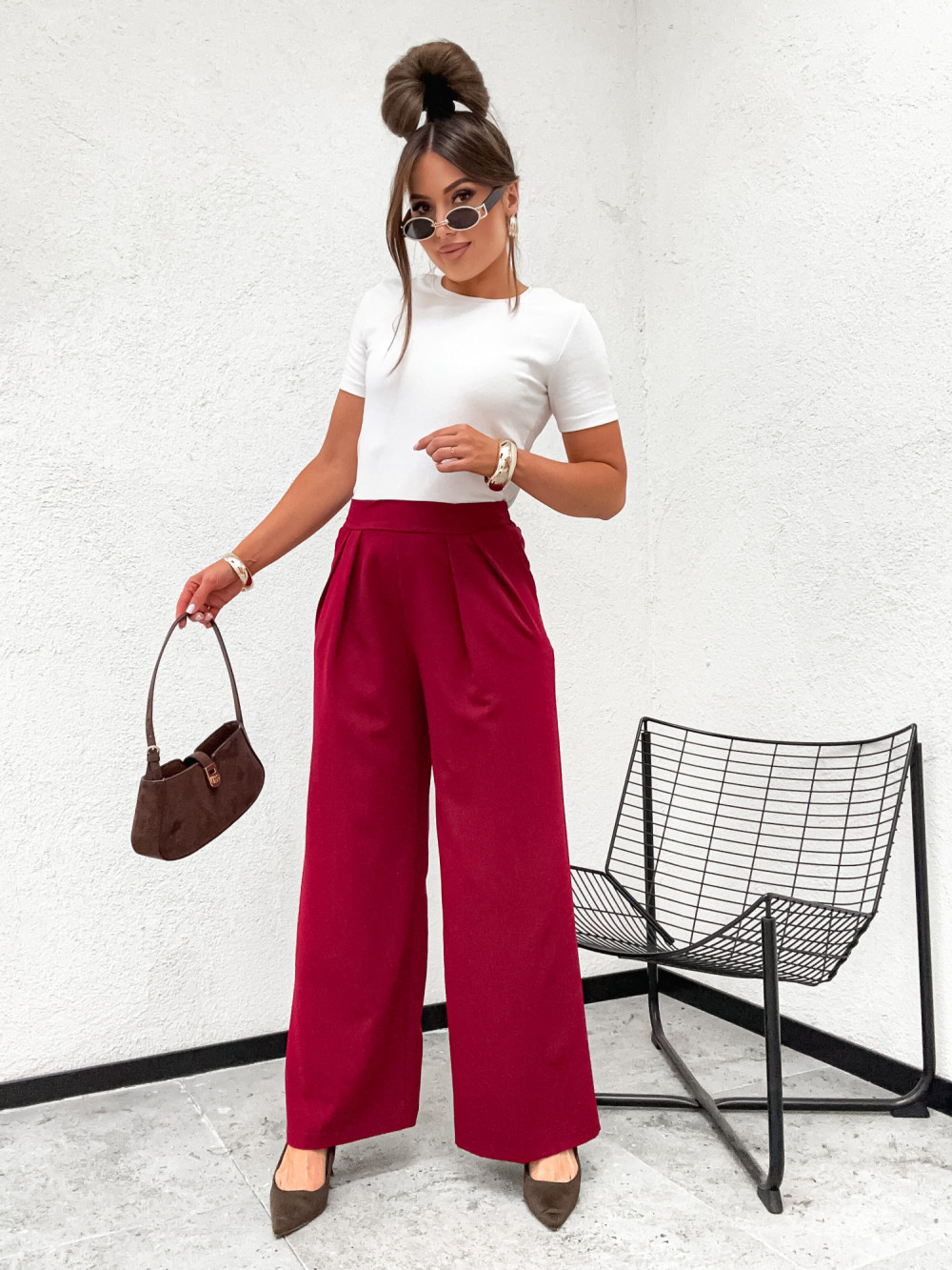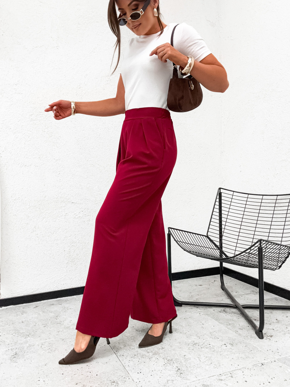 Eleganckie spodnie w kolorze bordowym to doskonały sposób na przełamanie rutyny oficjalnych stylizacji. Modny fason świetnie dopasowuje się do sylwetki, podkreślając jej największe atuty. Luźne nogawki zapewniają wygodę i są bardzo praktyczne. Stylowe eleganckie spodnie możesz wykorzystać w zestawieniu z koszulą na ważniejsze okazje lub T-shirtem w casualowych lookach.