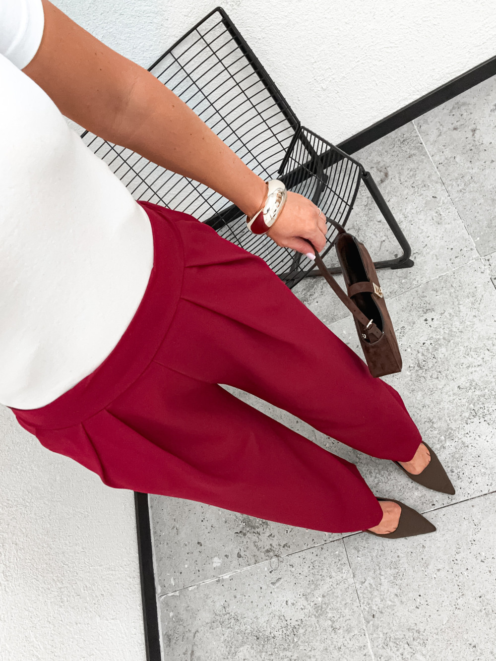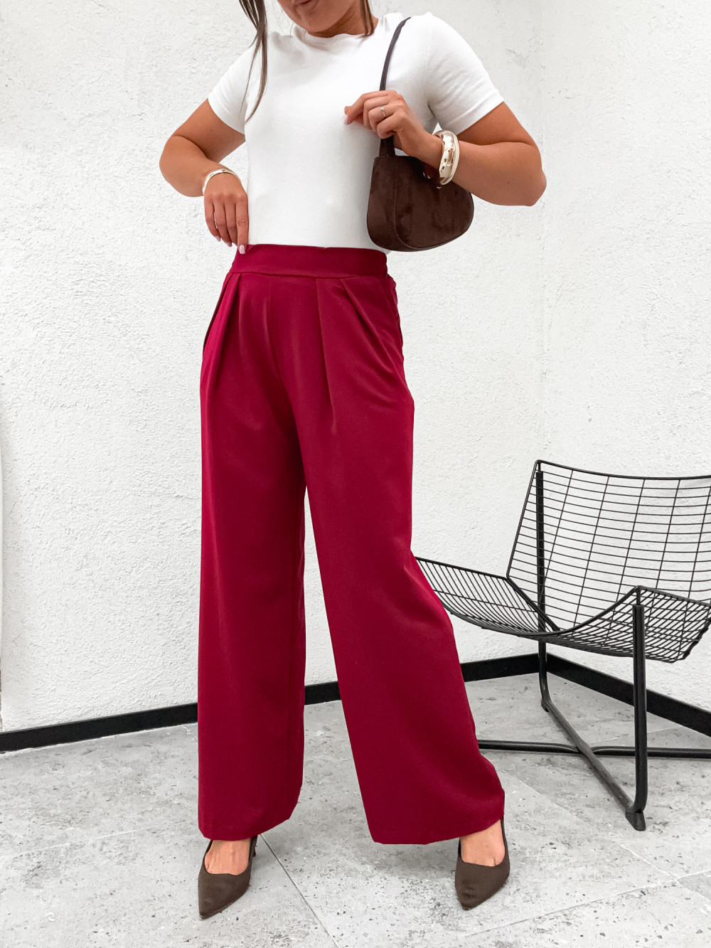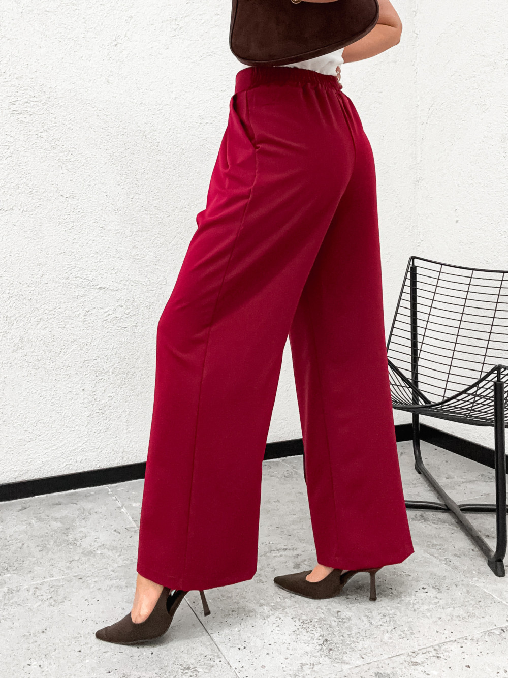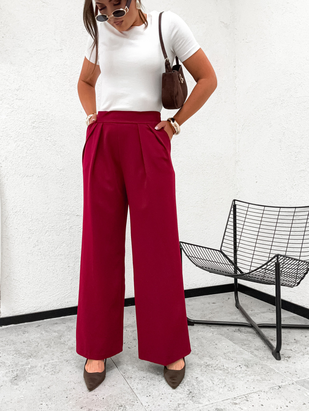 Eleganckie spodnie w kolorze bordowym to doskonały sposób na przełamanie rutyny oficjalnych stylizacji. Modny fason świetnie dopasowuje się do sylwetki, podkreślając jej największe atuty. Luźne nogawki zapewniają wygodę i są bardzo praktyczne. Stylowe eleganckie spodnie możesz wykorzystać w zestawieniu z koszulą na ważniejsze okazje lub T-shirtem w casualowych lookach.
