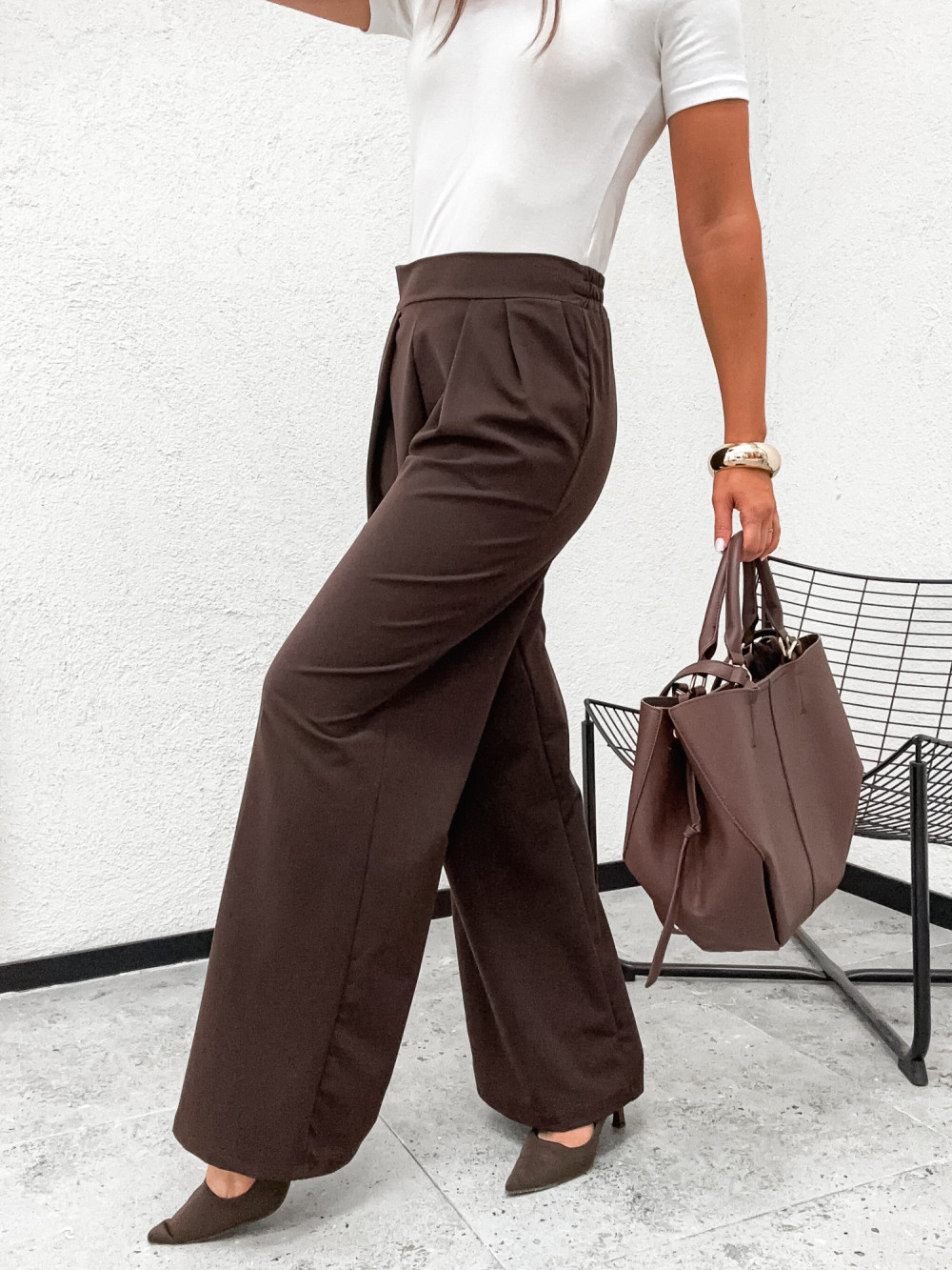 Eleganckie spodnie w kolorze brązowym to uniwersalny element damskiej garderoby, który można wykorzystać zarówno w codziennych, jak również w oficjalnych stylizacjach. Swobodny fason świetnie komponuje się z elegancką koszulą lub dopasowanym T-shirtem. Stylowe eleganckie spodnie są połączeniem wygody i świetnego wyglądu.