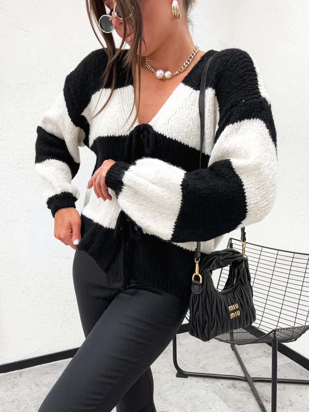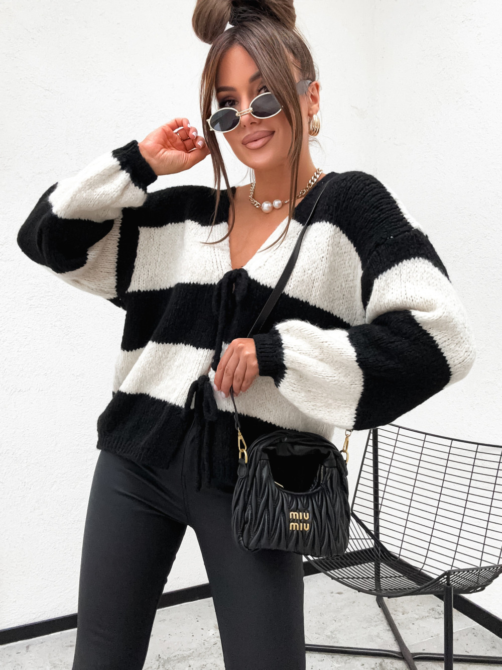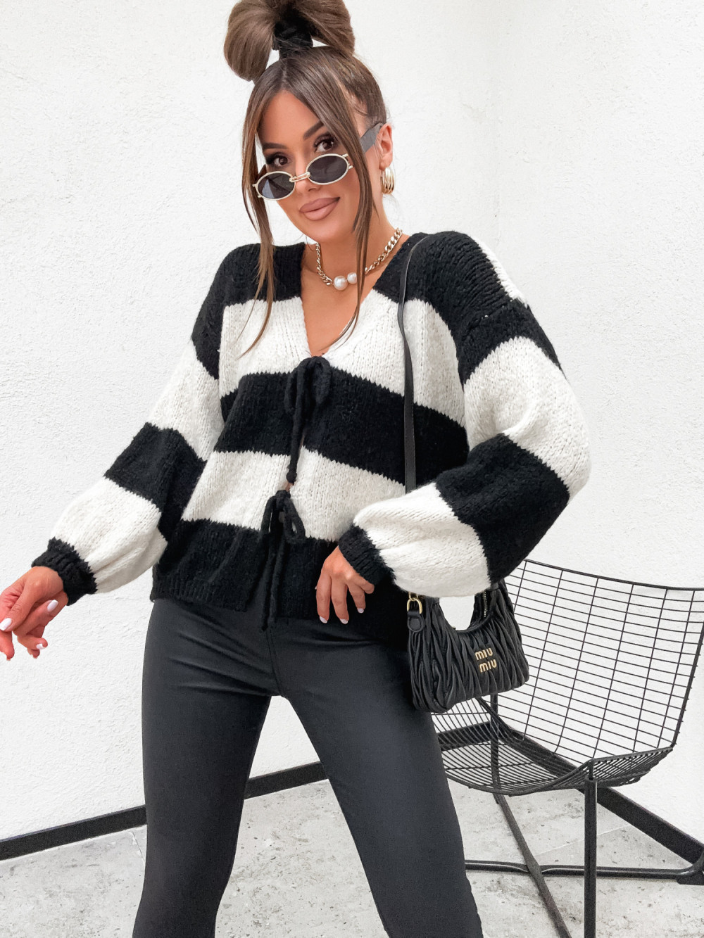 Ciepły wiązany sweter w paski idealnie sprawdzi się w zestawieniach na chłodniejsze dni. Kultowy model możesz łączyć z elegancką koszulą lub swobodnym T-shirtem. Uniwersalny wiązany sweter sprawdzi się w wielu zestawieniach na różne okazje, zapewniając komfort termiczny, swobodę i doskonały wygląd.