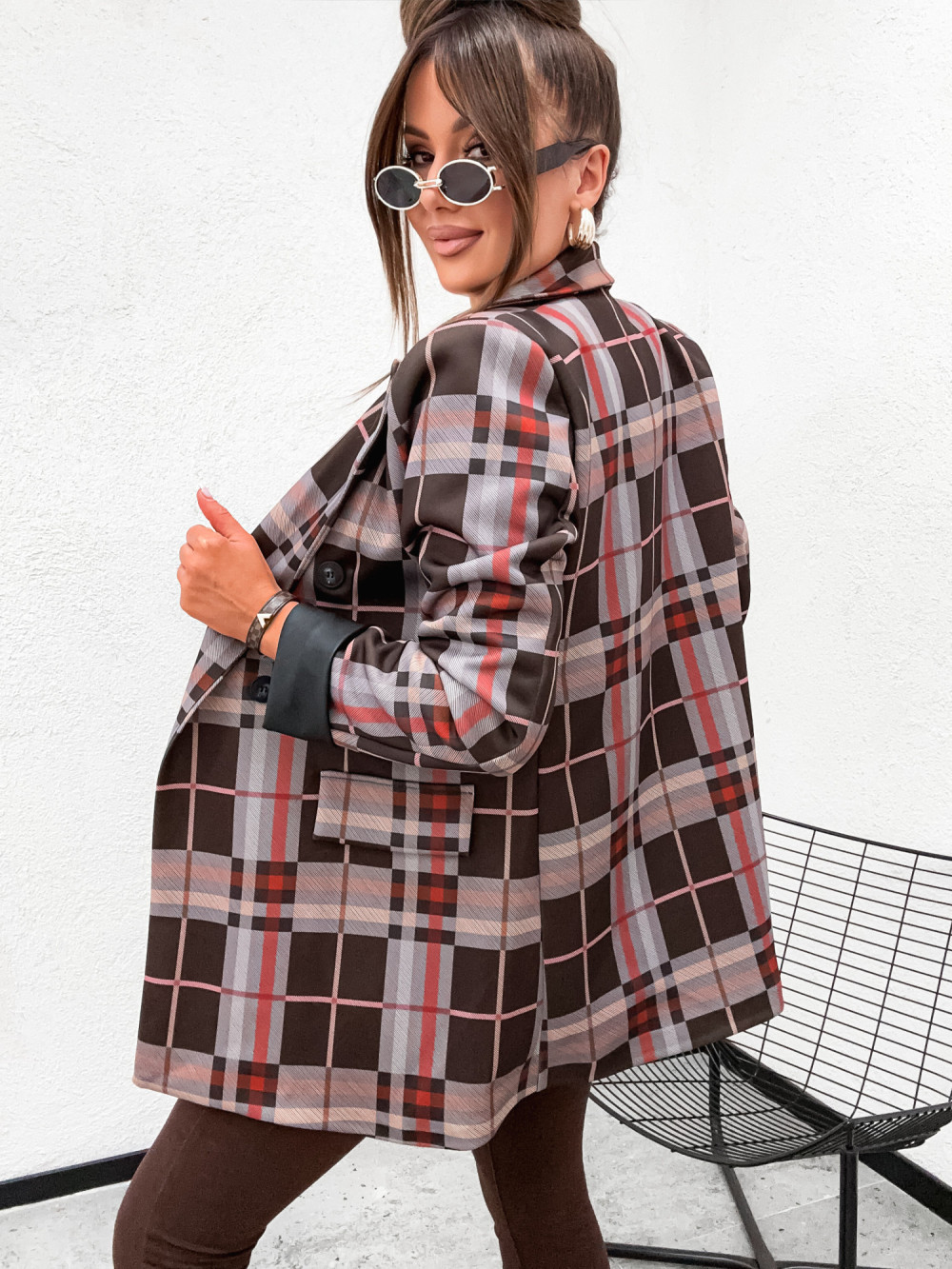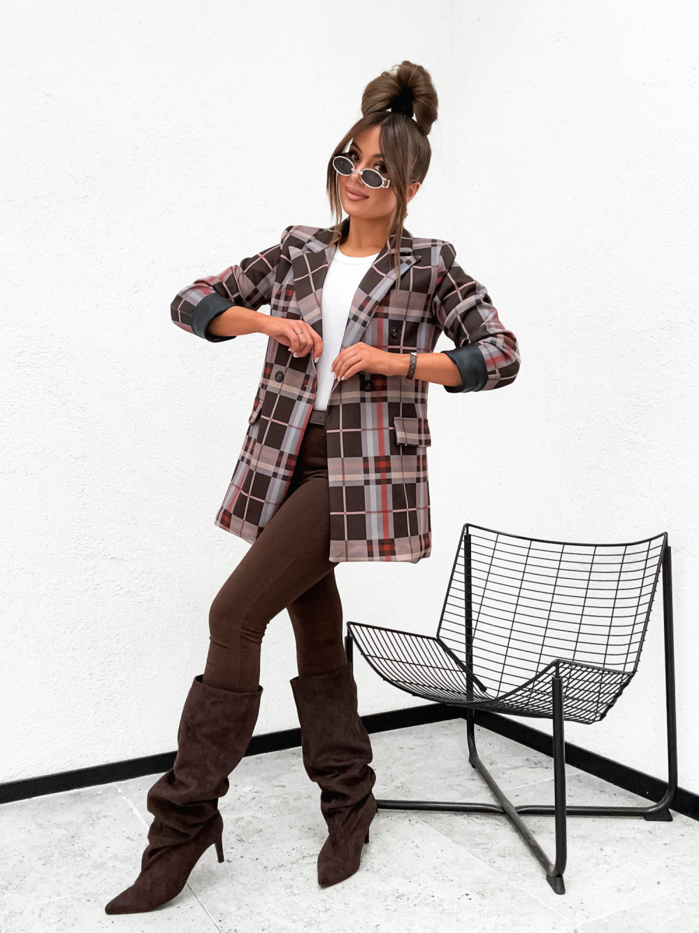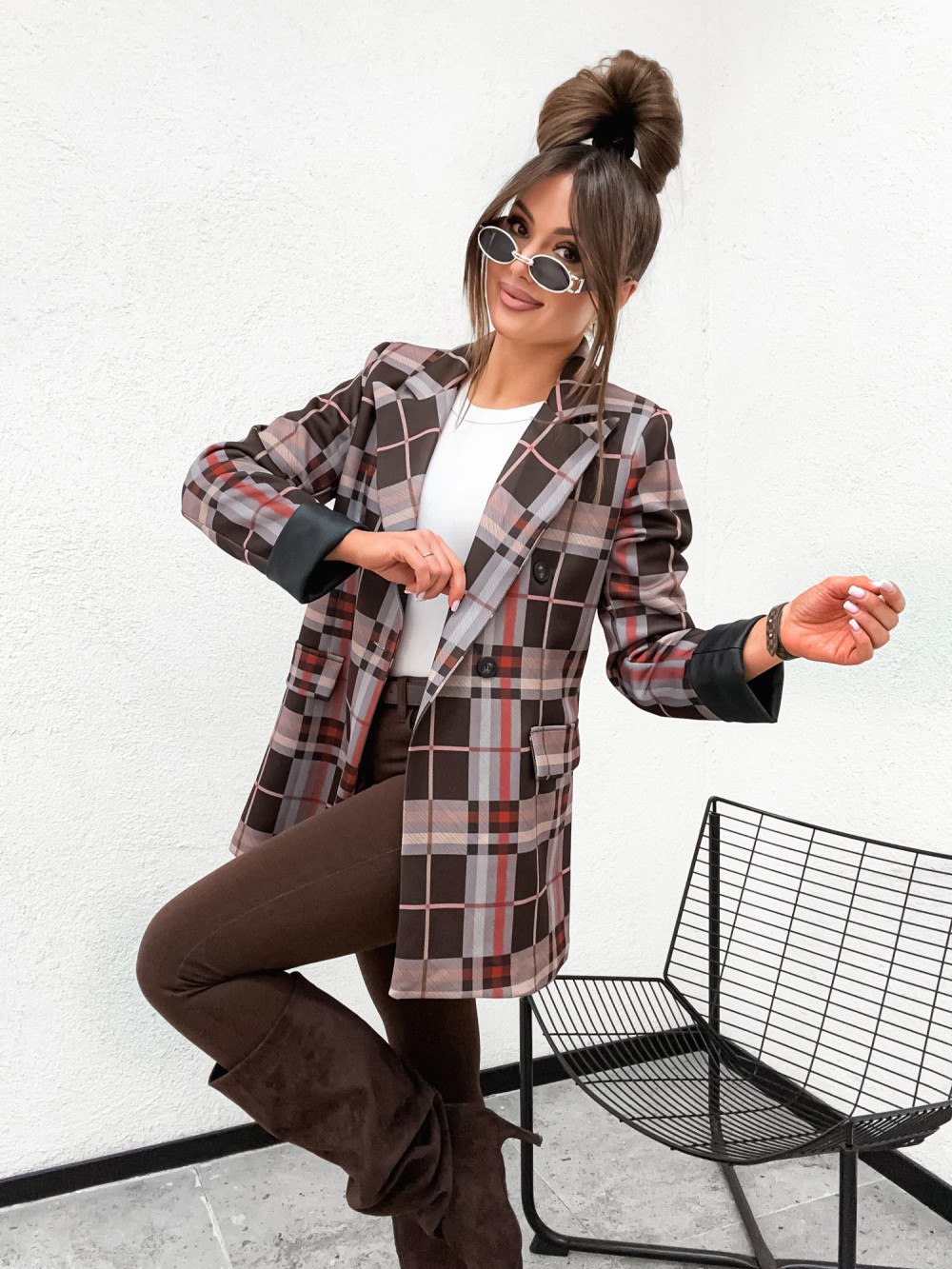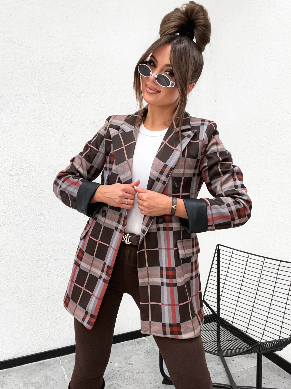 Marynarka w kratkę CLARESSA STYLE wywijane skórzane rękawy CHOCCO