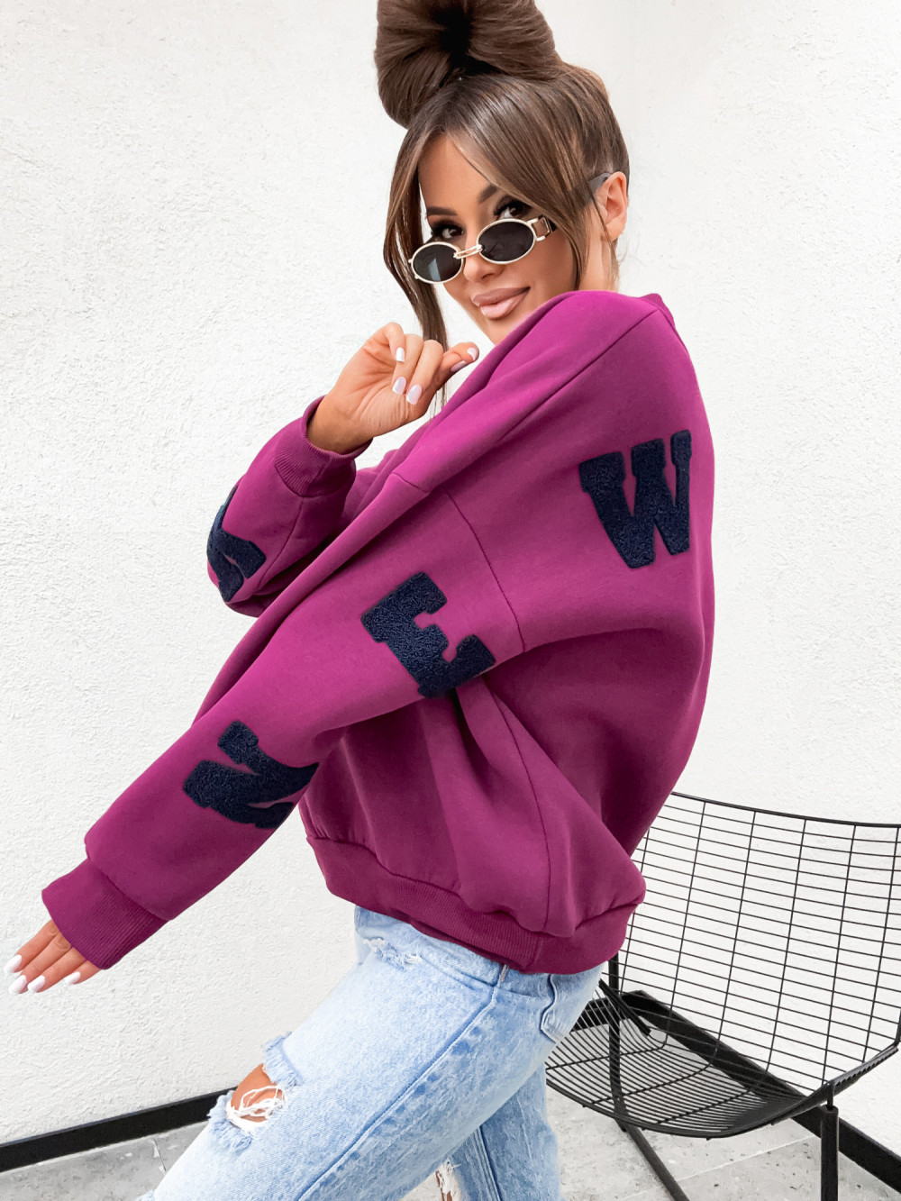 Bluza bawełniana w kolorze magenta wyróżnia się napisem umiejscowionym wzdłuż ramion. Swobodny fason świetnie dopasowuje się do różnych typów sylwetki, zapewniając wygodę i świetny wygląd. Modna bluza bawełniana pasuje do spodni jeansowych lub spodni dresowych za każdym razem tworząc stylowe zestawienie.