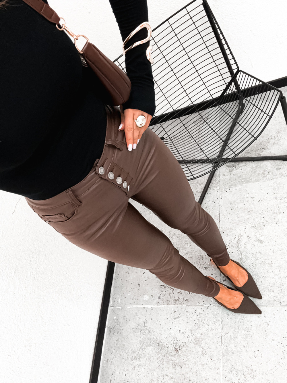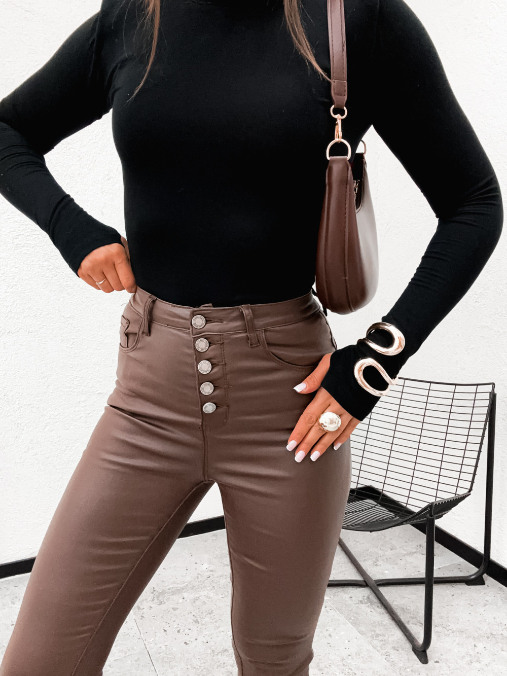 Eleganckie spodnie woskowane w brązowym kolorze to modna propozycja na chłodniejsze dni. Dopasowany fason świetnie podkreśla kobiece kształty i idealnie układa się na sylwetce. Stylowe spodnie woskowane możesz łączyć z T-shirtem w codziennych zestawieniach lub elegancką koszulą w bardziej oficjalnych stylizacjach.