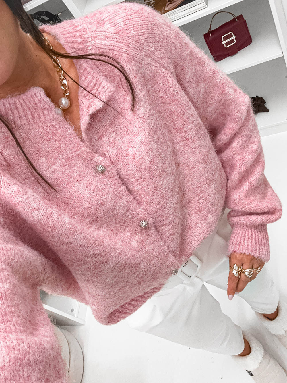 Różowy sweter kardigan z domieszką wełny jest bardzo ciepły i delikatny w dotyku, dzięki czemu przyjemnie otula i zapewnia maksymalny komfort. Stylowy fason do bioder świetnie podkreśla sylwetkę, a swobodny krój zapewnia swobodę ruchów. Modny sweter kardigan możesz łączyć z jeansami, spódnicą, jak również z eleganckimi spodniami.