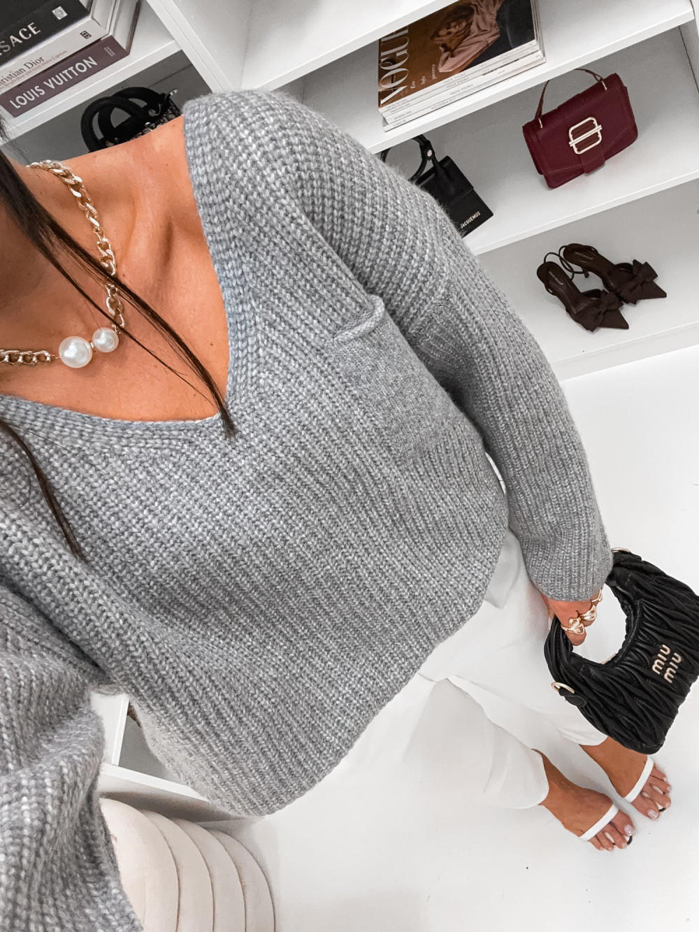Sweter klasyczny z kieszonką V-NECK oversize MELANŻ GRAY