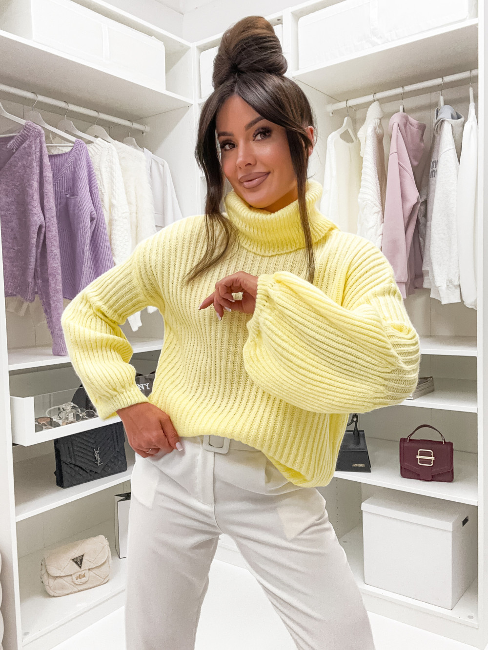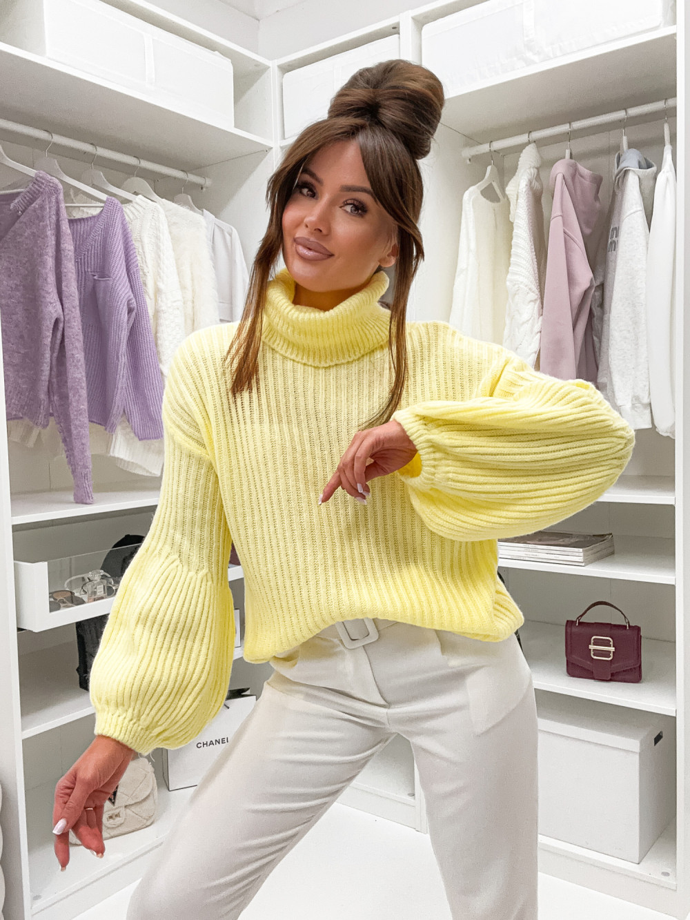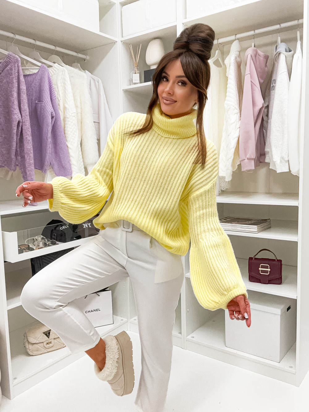 Żółty sweter z golfem to połączenie komfortu i wyrazistego stylu. Jego luźny, oversizowy krój gwarantuje pełną swobodę ruchów, a szersze rękawy dodają całości wyjątkowego, modowego akcentu. Miękka i ciepła dzianina sprawia, że sweter jest niezwykle przyjemny w noszeniu. Doskonale komponuje się zarówno z jeansami, jak i bardziej swobodnymi spodniami dresowymi, dzięki czemu świetnie sprawdzi się w wielu codziennych stylizacjach.