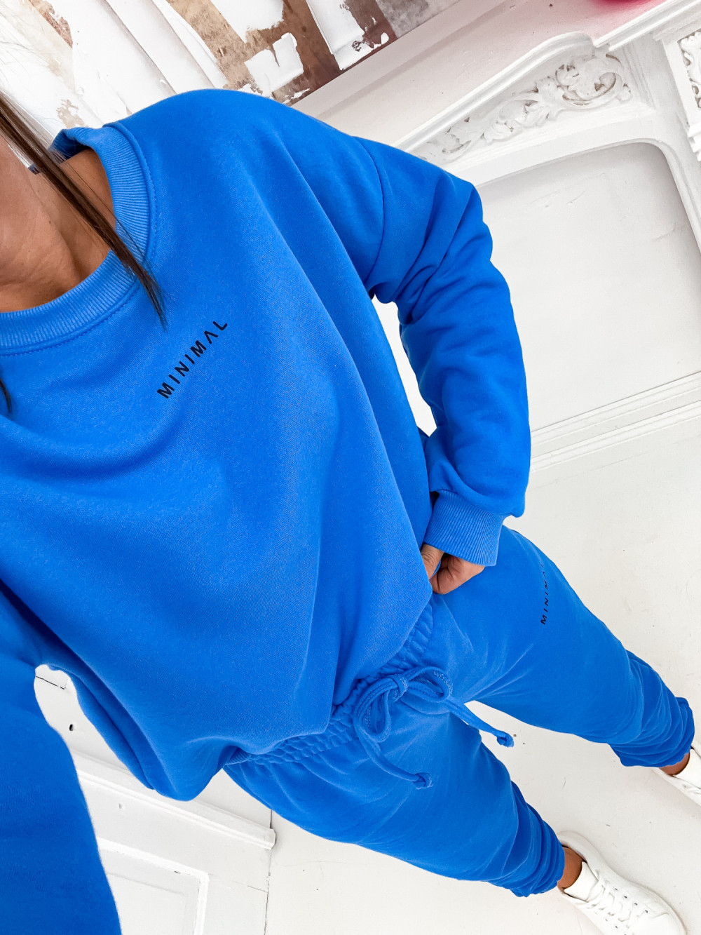 Modny komplet w królewskim odcieniu niebieskiego. Jesteśmy przekonani, że ten model świetnie ułoży się na Twojej sylwetce i pozwoli cieszyć się komfortem noszenia. Składa się z luźnej bluzy z napisem oraz spodni z wyższym stanem. Wyróżnia się piękną barwą i naprawdę modnym designem. Dobierz do kompletu damskiego adidasy.