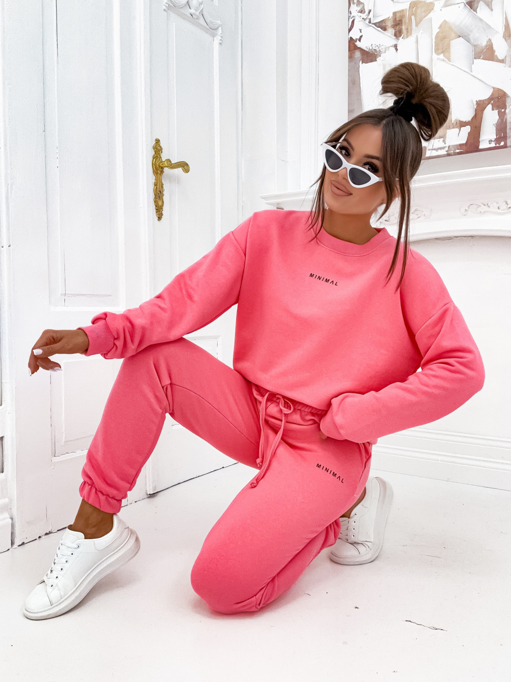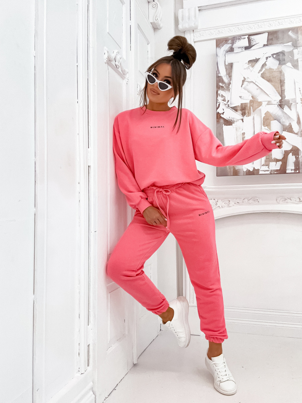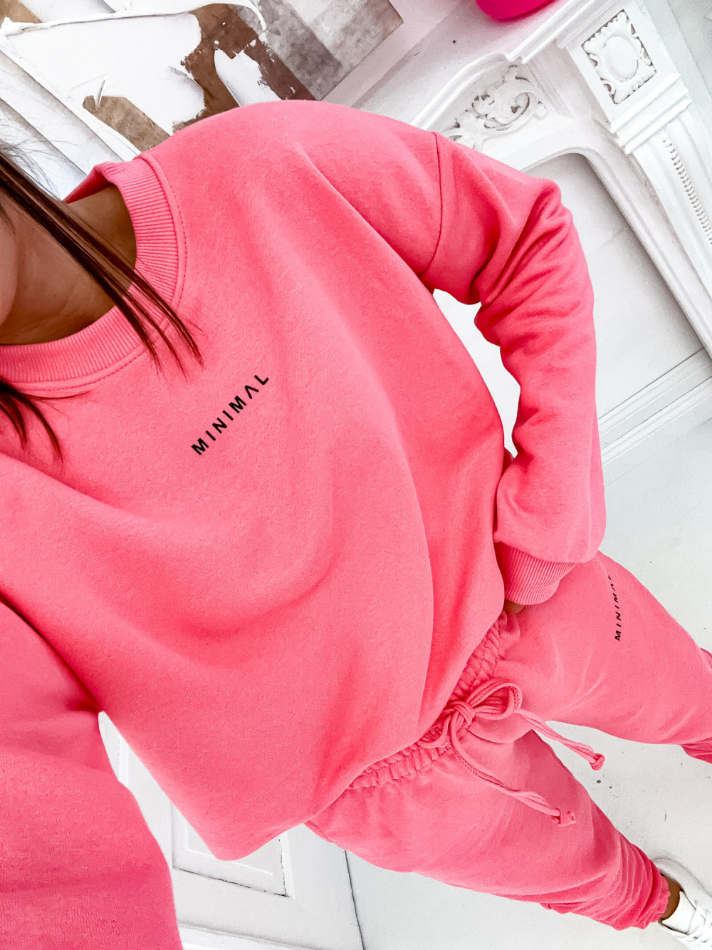 Stylowy komplet damski w kolorze koralowym. Składa się z oversize’owej bluzy z napisem „minimal” i spodni dresowych. Sportowy zestaw doskonale sprawdzi się w sezonie wiosenno-letnim, zwłaszcza w połączeniu z butami sportowymi i czapką z daszkiem. Jesteśmy przekonani, że ten komplet świetnie ułoży się na Twojej sylwetce.