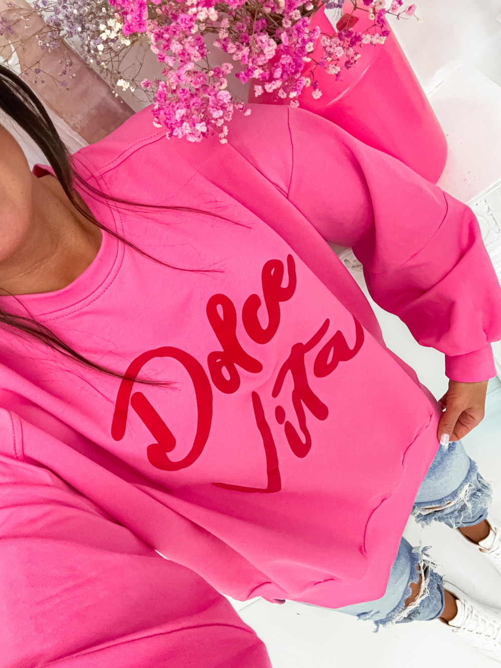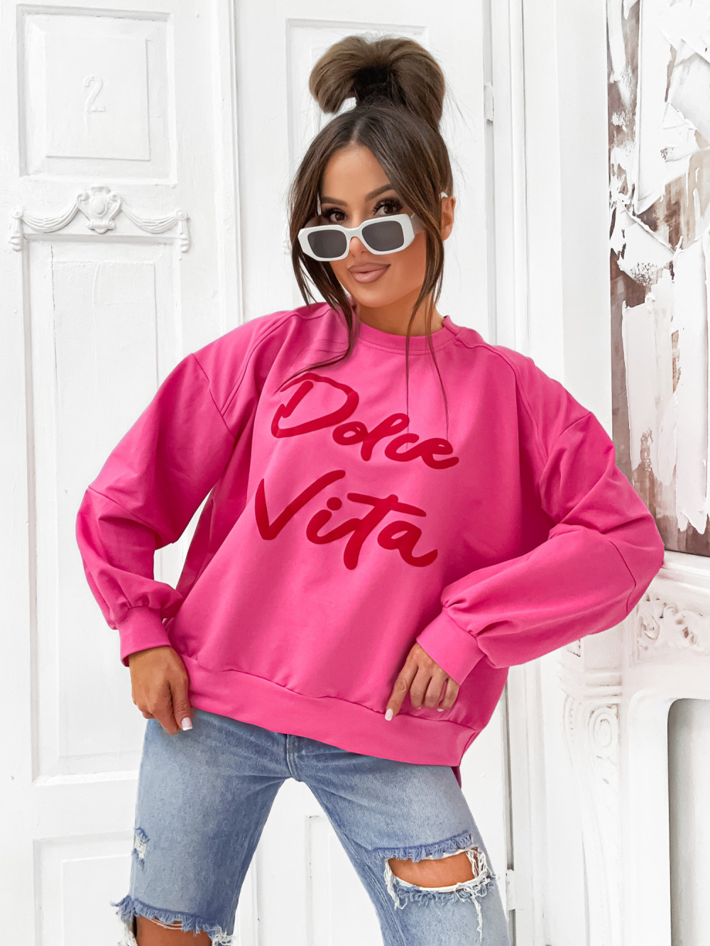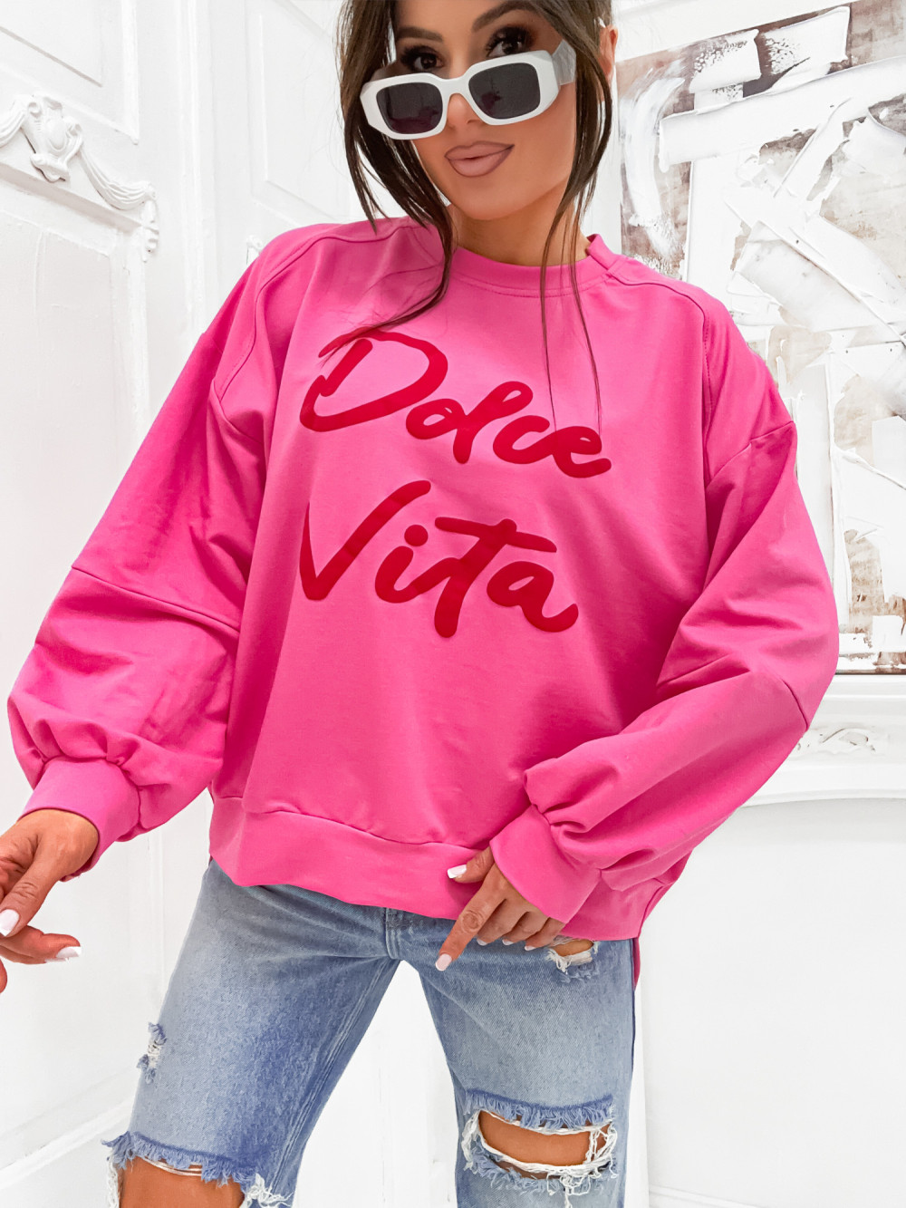 Różowa bawełniana bluza z optymistycznym napisem Dolce vita to idealna propozycja dla kobiet, które chcą wyrazić pozytywne podejście do życia poprzez styl. Komfortowy fason dobrze układa się na sylwetce i zapewnia swobodę ruchów. Doskonale sprawdzi się zarówno w zestawieniu z jeansami, jak i w sportowych stylizacjach.