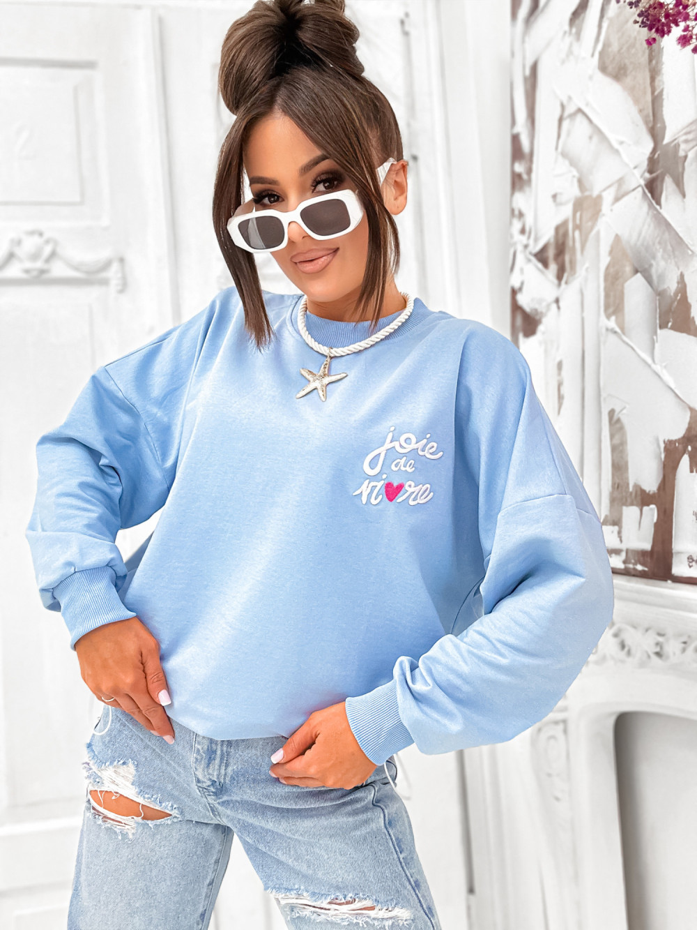Bawełniana bluza z uroczym zdobieniem to uniwersalna propozycja, która doskonale wpisuje się w różnorodne stylizacje. Jej swobodny fason uzupełniono praktycznymi ściągaczami przy rękawach i w pasie, co zapewnia dobre dopasowanie i atrakcyjny wygląd. Świetnie komponuje się z jeansami, spodniami dresowymi oraz spódnicą.